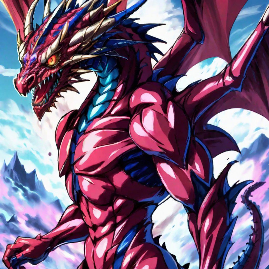 a close up of a person with a dragon like body and a dragon like head, slifer the sky dragon, human and dragon fusion, colorful muscular eldritch, guyver style, male djinn man demon hybrid, vegetal dragon cyborg, guyver dark hero, yugioh artwork, colossal dragon as background, yugioh art style, dragon cyborg