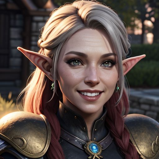 female 1, Elf, 30th age, long hair, red hair, grey skin, flinge on face, happy, smile, by elder scrolls online, dark elf race.