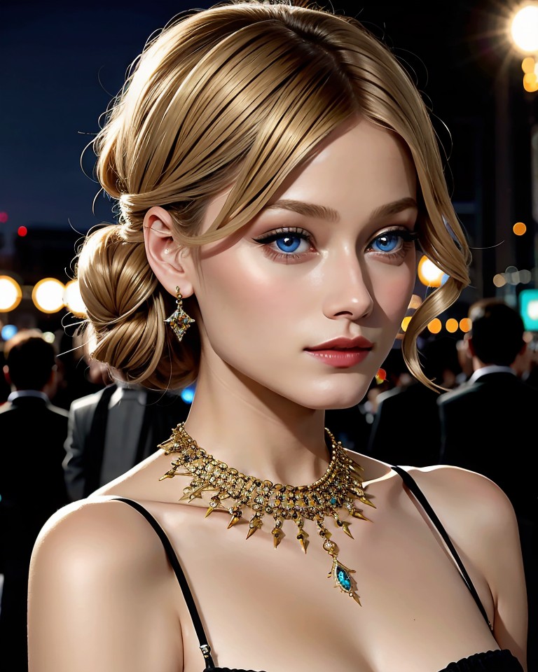 Chz-OliviaTD, 8k, RAW photo of 1girl as a star of Old Hollywood, close-up, face focus, vintage designer dress, eye-catching jewelry, expertly applied cosmetics, elegant updo, on the red carpet, 1940s glamor, outside, evening, posing for the press, the golden age of film, artistic composition, volumetric lighting, (meticulously-detailed, Ultra-HD-realistic:1.3), (perfect eyes, masterpiece, best quality:1.5),