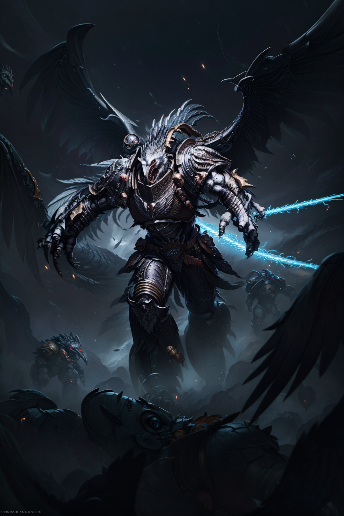 volumetric cinematic lighting, (highly detailed:1.4), digital render, octane render, smooth, sharp focus, full body 8k unity render, action shot, realistic reflections, cinematic composition, <lora:tool - more_details:0.7> CORVUS, <lora:Corvus MK1 by CARAXES:0.8> silver details, MONSTER, DEMON, claws, WINGS, intricate ornamented, full armor, FEATHERS, holding whip, (((WARP MUTATION:1.0))), SHARP TEETH, worn armor, fierce looking in a dynamic posture, flying to battle, planetary destruction, war, futuristic background, particles floating, cloudy winter sky, very dark lighting, heavy shadows,