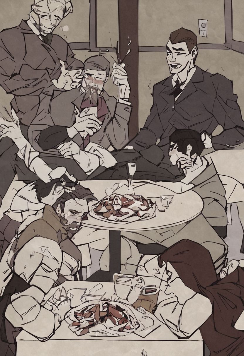 <lora:bilola-12:1> <lora:malemast-10:1> male masturbation at the dinner table with people at table watching excitedly