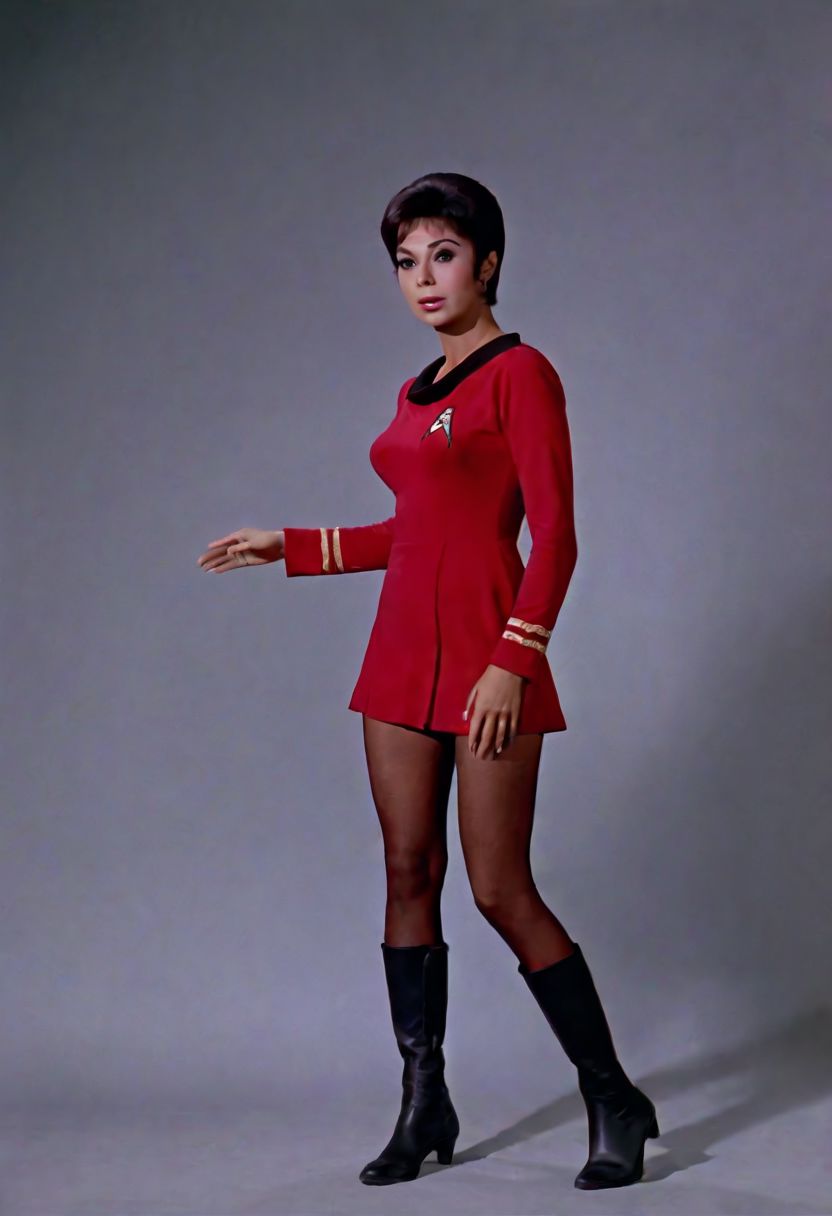 Daliah Lavi wearing star trek tos tight uniform dress, red low cut A-line miniskirt minidress, knee boots, pantyhose, startrektos , startrektos dress, full length, full view, long legged, narrow waist, narrow hips, high contrast, ultra detailed, ultra quality, intricate details, beautifully shot, sharp focus, vivid, realistic, photographic, star trek bridge background