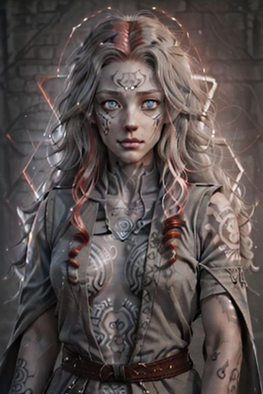 human female, (feminine:1.7), (beautiful face, detailed face:1.6), (beautiful Grey eyes, detailed eyes:1.7), (looking at viewer, eye contact, intense:1.6), (long hair, red hair, curly hair:1.3), , ((masterpiece, best quality, high resolution, realistic, best quality,)), photo realistic, Perfect Face, (detailed face). <lora:GoodHands-vanilla:0.6> <lora:add-detail-xl:0.8>, mage, white military uniform coat, dagger, rune dagger, glowing runes, , (((glowing magic symbols tattoos))), ((face tattoos)), glowing tattoos, stone tower in the background