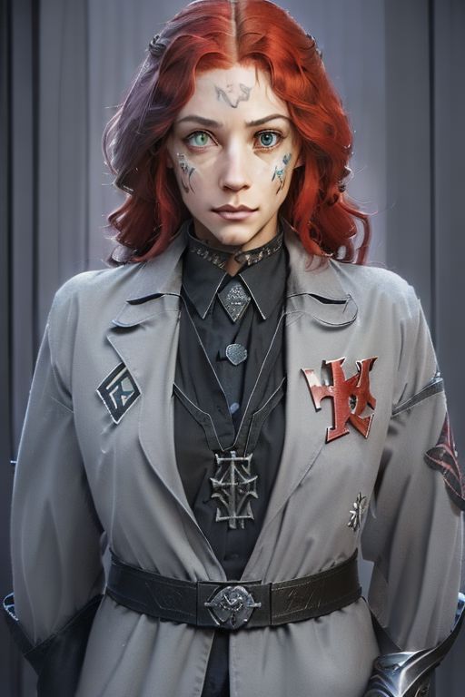 human female, (feminine:1.7), (beautiful face, detailed face:1.6), (beautiful Grey eyes, detailed eyes:1.7), (looking at viewer, eye contact, intense:1.6), (long hair, red hair, curly hair:1.3), , ((masterpiece, best quality, high resolution, realistic, best quality,)), photo realistic, Perfect Face, (detailed face). <lora:GoodHands-vanilla:0.6> <lora:add-detail-xl:0.8>, mage, white military uniform coat, dagger, rune dagger, glowing runes, , (((glowing magic symbols tattoos))), ((face tattoos)), glowing tattoos, stone tower in the background