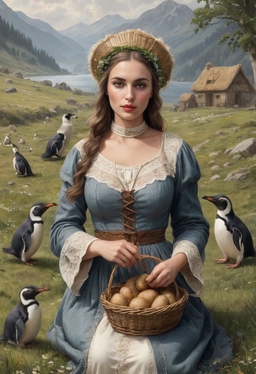 A confident and alluring medieval maiden sits in the center of the frame, holding a wicker basket full of potatoes. She wears an Eskimo hat on her head, big tits. Birds are walking around her. In the background, a flock of penguins grazes on a meadow. Use a realistic painting style with detailed textures. Pay attention to the details of the maiden's outfit, such as the lace and embroidery. Also include a variety of birds and penguins.