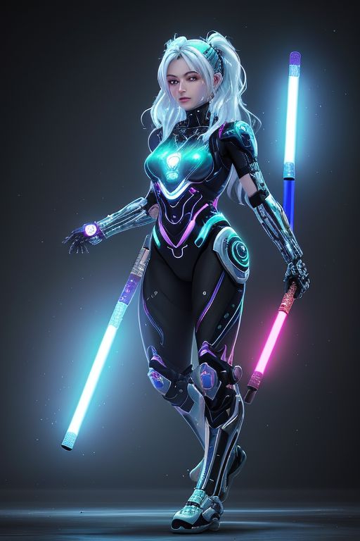 high quality, 8K Ultra HD, full body, have a cyber saber, a mesmerizing 20-year-old woman with a futuristic beauty that seems to transcend time and space, intricately woven into her very being, encased in the cybernetic suit, move with fluidity and precision, Her flowing hair resembles streams of neon lights, casting a vibrant glow that adds a touch of cyberpunk brilliance to her appearance, Each strand of hair is meticulously crafted with holographic patterns that shimmer and shift, creating an ever-changing display of colors, by yukisakura, highly detailed,