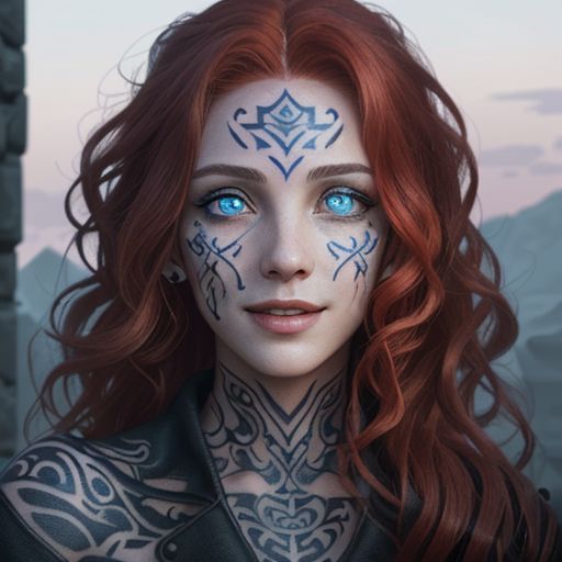 human female, (feminine:1.7), (beautiful face, detailed face:1.6), (beautiful eyes, detailed eyes:1.7), (looking at viewer, eye contact, intense:1.6), (smiling, open mouth:1.2), (long hair, red hair, curly hair:1.3), , ((masterpiece, best quality, high resolution, realistic, best quality,)), photo realistic, Perfect Face, (detailed face). <lora:GoodHands-vanilla:0.6> <lora:add-detail-xl:0.8>, mage, white military coat, dagger, rune dagger, glowing runes, , (((glowing magic symbols tattoos))), ((face tattoos)), glowing tattoos, stone tower in the background