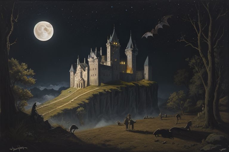 oil painting, of a castle on a cliff, forest, night, a flock of bats flying in the dark sky, quarter moon, dark theme, still life, shadows