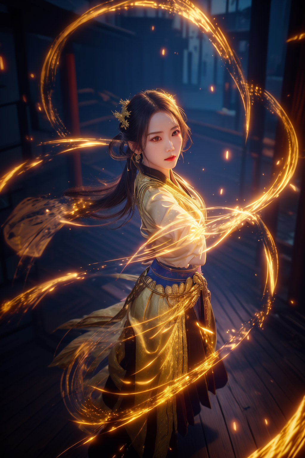 golden-aura,using golden-magic,golden-magic,ancient-costume,dancing,fighting stance,1girl,solo,<lora:magic_fighting_golden_512_15:0.8>,