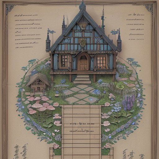 <lora:ParchartXL-1.5:1>,ON PARCHMENT, INK ILLUSTRATION, bl3uprint,<lora:bl3uprint:1>, A detailed blueprint for the construction of an elf garden, a fairytale-style wooden house, Blueprint, a large number of flowers, flower borders, stone roads, low bridges, detailed labeling text, grid lines,