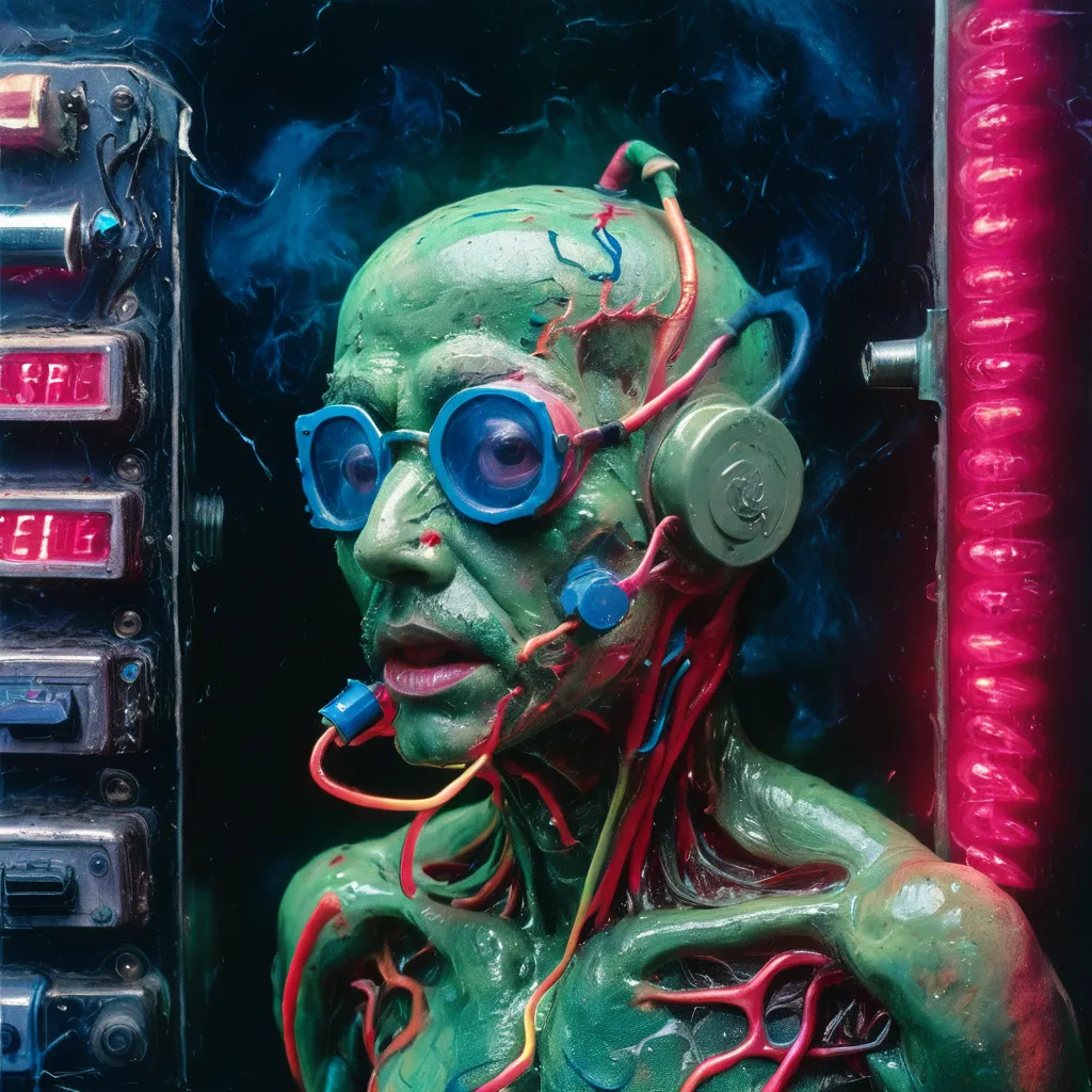Vintage Toy Raygun, vintage street photo, blubber organism, smoldering skin, glossy circuit board cellular frame, electrified maggot limbs, vacuum tube amp wires, twisted neck, oozing pulsating matter, spewing larva vomit from large bubbles, translucent mask sack with veins showing multi colored nervous system, neon glow background, insanely detailed, art by Art Bell <lora:Vintage_Toy_Raygun:1.3> <lora:iris-xl:1> <lora:Vintage_Street_Photo:0.35>