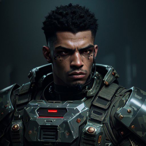 cyberpunk film, raw photo of man, 3/4, soldier, armor, Camouflage, tough guy, chiselled jaw, gigachad, plasma riffle, deep night, dark room, hight quaility, detailed skin,African American, Black man, clear face, detailed hair, Black hair, military hair cut, cinema shot, hdr, sharp focus