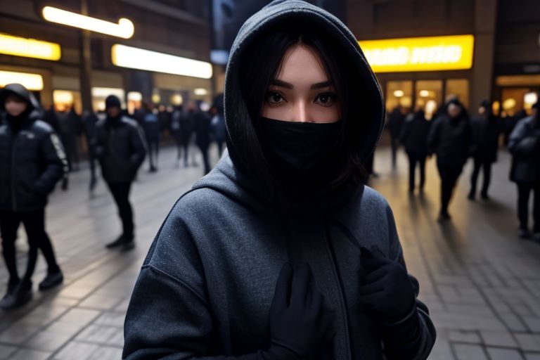 close up, 1girl, white hair, yellow eyes, ukdrill,black pants,black hoodie,glowing,hood up,black gloves,scarf,covered mouth, spring outside, busy street full of people, shopping mall, night, cinematic lighting, absurdres, volumetric lighting , masterpiece, (super detailed),