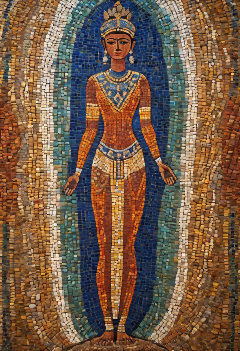 award winning photography, Nikon, A photograph, stylized traditional minoan, mosaic of elongated stones in vibrant colors such as blue, orange, red, yellow, and green creates a silhouette of a beautiful full size female body waving. beautiful face, 2D, 8k, extremely high resolution, highly detailed