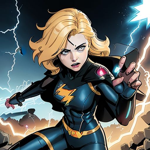((heroine, female superhero)), ((Storm (X-Men) + Elsa Jean)), ((superpowers)), ((cape)), ((tight costume)), ((blonde hair)), ((blue eyes)), ((curvy body)), ((muscular legs)), ((confident pose)), ((energy manipulation)), ((lightning bolts)), ((fighting)), ((skeleton monster)), ((villain)), ((battle scene)), ((dramatic lighting)), ((detailed background)), ((comic book style)), ((illustration)), ((best quality)), ((masterpiece)), ((highly detailed)), score\_9, score\_8\_up, score\_7\_up, artsy, high contrast, <lora:comic/dynamic\_comic\_panel:0.8> <lora:comic/marvel\_dc\_style:0.8> <lora:monster/horror\_skeletons:0.8>