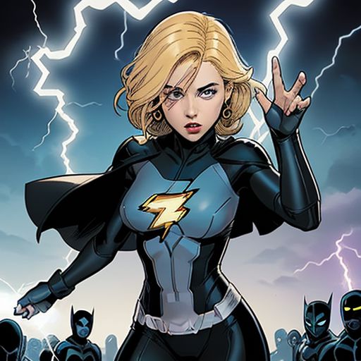 ((heroine, female superhero)), ((Storm (X-Men) + Elsa Jean)), ((superpowers)), ((cape)), ((tight costume)), ((blonde hair)), ((blue eyes)), ((curvy body)), ((muscular legs)), ((confident pose)), ((energy manipulation)), ((lightning bolts)), ((dramatic lighting)), ((detailed background)), ((comic book style)), ((illustration)), ((best quality)), ((masterpiece)), ((highly detailed)), score\_9, score\_8\_up, score\_7\_up, artsy, high contrast, <lora:comic/dynamic\_comic\_panel:0.8> <lora:comic/marvel\_dc\_style:0.8>