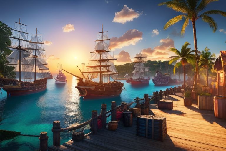 (masterpiece:1.2), (best quality,:1.2), 8k, HDR, ultra detailed, ((photorealistic)), A landscape view of a a city by the sea in the afternoon. Pirate ships docked unloading cargo, outside a tavern over looking a busy harbor in the caribbean, waving palm trees. afternoon sun, blue sky, calm sea, no people, professional light, cinematic lighting, ambient lighting, sunset,