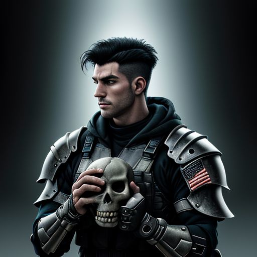 cyberpunk film, raw photo of man, 3/4, soldier, armor, Charcoal and mauve tiger stripped camouflage, Holding a human skull in his right hand, tough guy, chiselled jaw, gigachad, plasma riffle, deep night, dark room, high quality, detailed skin, clear face, clean face detailed hair, Black hair, military hair cut, cinema shot, hdr, sharp focus