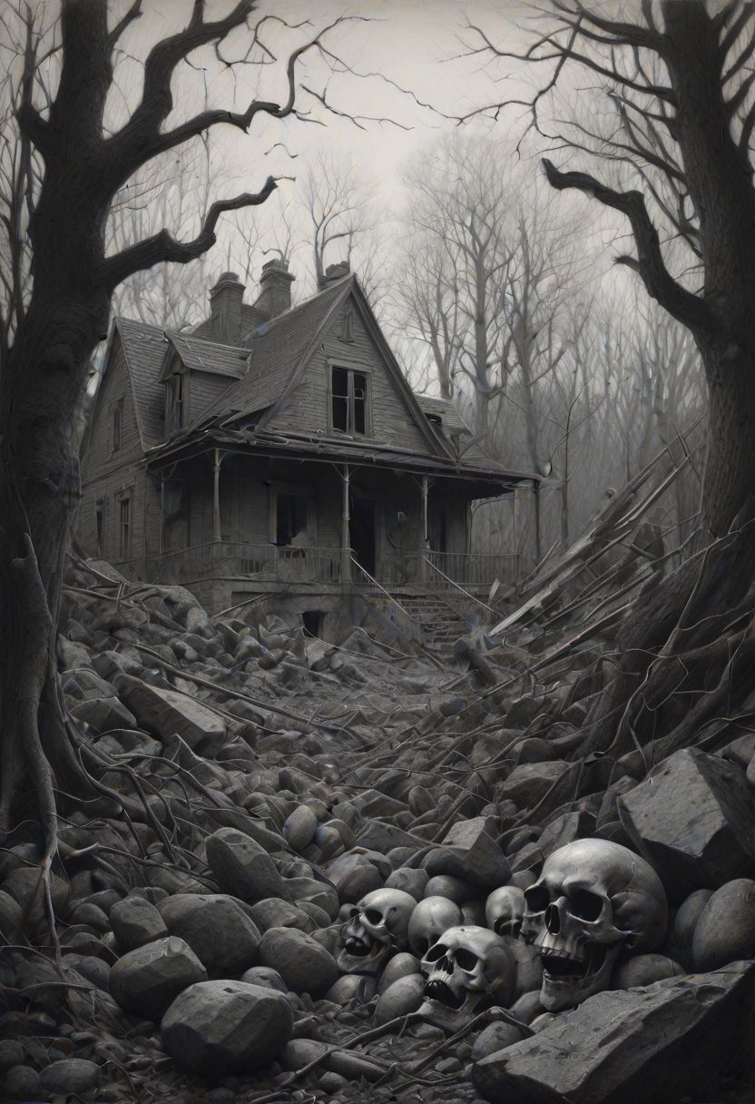 Black and white pencil drawing, (Horror scene inspired by WW1:1.3), Detailed composition, Haunting atmosphere, (Broken skulls and dark rocks:1.2), Creepy trees, Abandoned setting, Enigmatic shadows, Mysterious allure, (Haunting narrative:1.2), Masterful shading, Detailed textures.