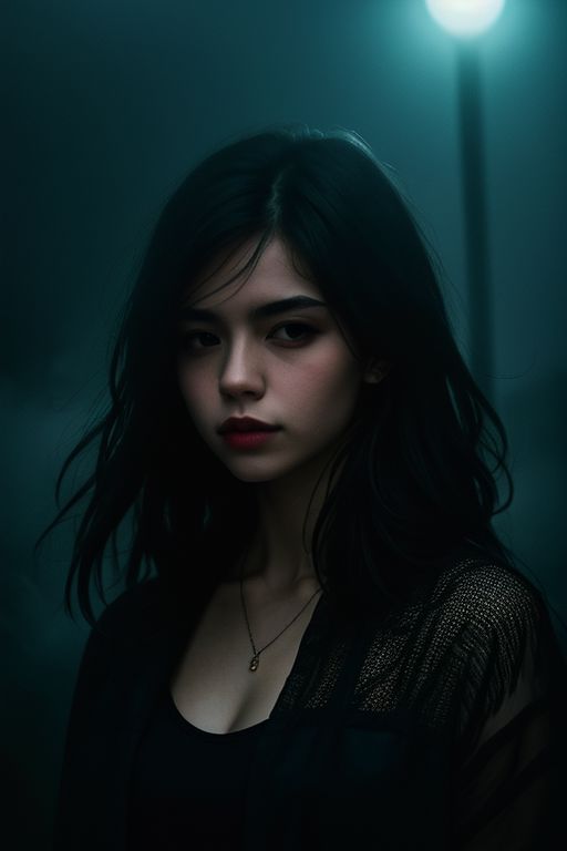 city street, neon, fog, volumetric, closeup portrait photo of young woman in dark clothes