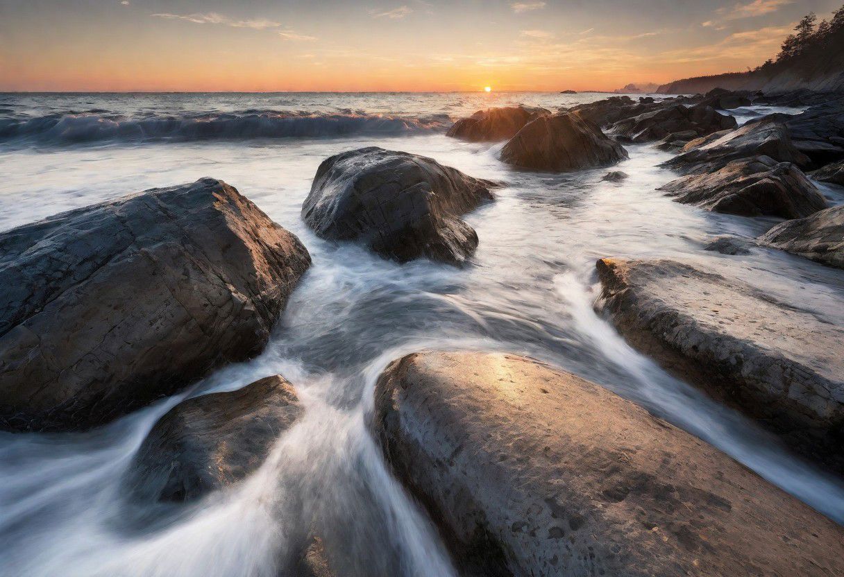 Break of dawn, small tranquil waves hits the rocky shore along a long beach, realistic, detailed, photograph, fine rock, intrinsic, wide shoot, sky