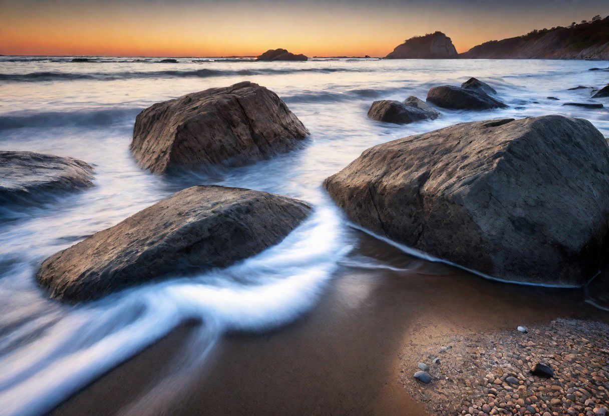 Break of dawn, small tranquil waves hits the rocky shore along a long beach, realistic, detailed, photograph, fine rock, intrinsic, wide shoot, sky