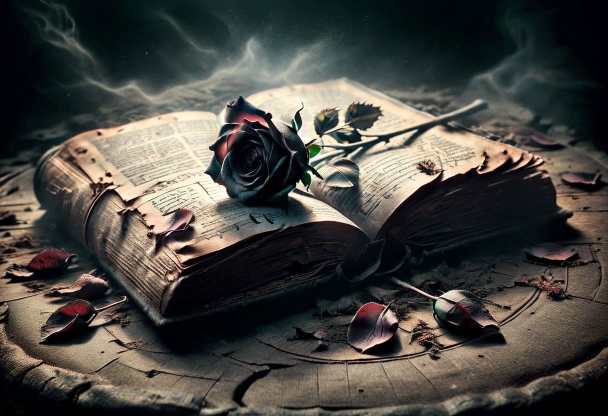A withered ais-crsd rose lying on an ancient book, its petals blackened and curled, on a table covered in dust. <lora:ais-crsd-sdxl:1>