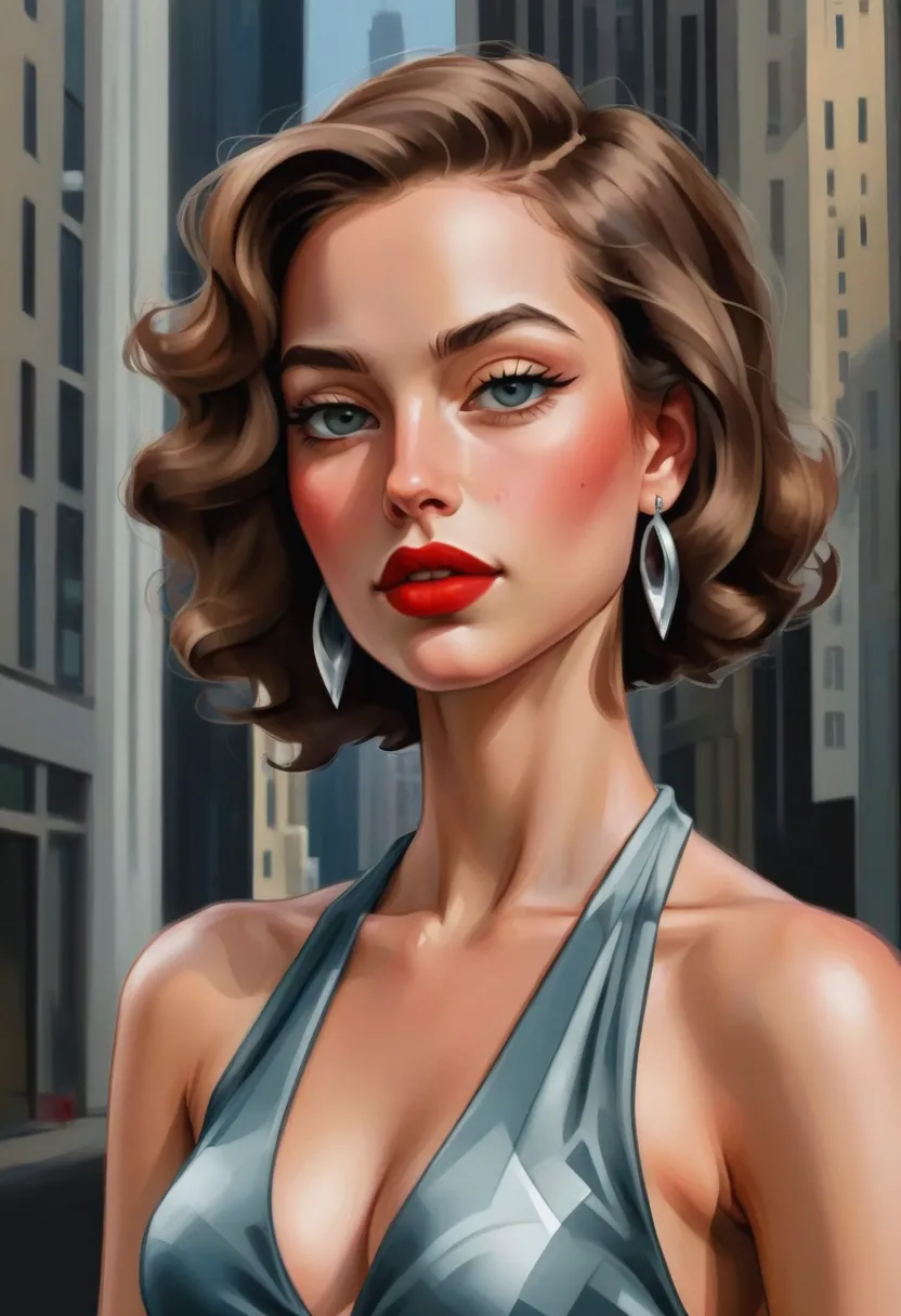 A digital painting in the style of Tamara de Lempicka, portraying a sophisticated woman in sleek, geometric lines and bold colors, she exudes confidence with a subtle smirk, set against a backdrop of minimalist urban architecture and swirling patterns <lora:CuteLora:1>