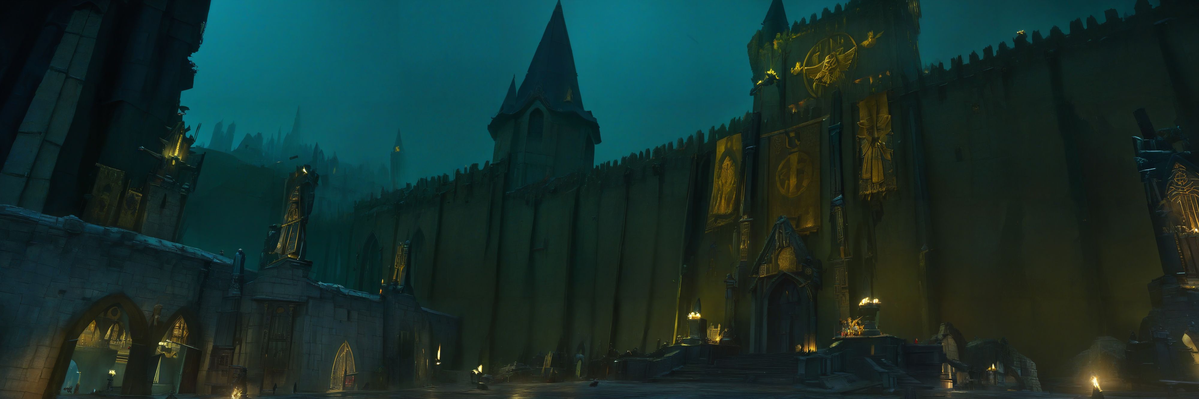 warhammer 40k, wh40k10m, Imperium of Man location, background,, gothic fortress monastery, gun placements, complex gothic architecture, watch tower,, symbolism, iconism, statue, heraldry, Imperium of Man location, The Aquila, two-headed eagle, shrine world, Gothic, Brutalistic, Dystopian, grim, dark, thunder storm, (view from orbit:2, gigantic:2,panorma:2, large scale:2) <lora:Wolvie_Style_wh40k10m_v1.0:1>