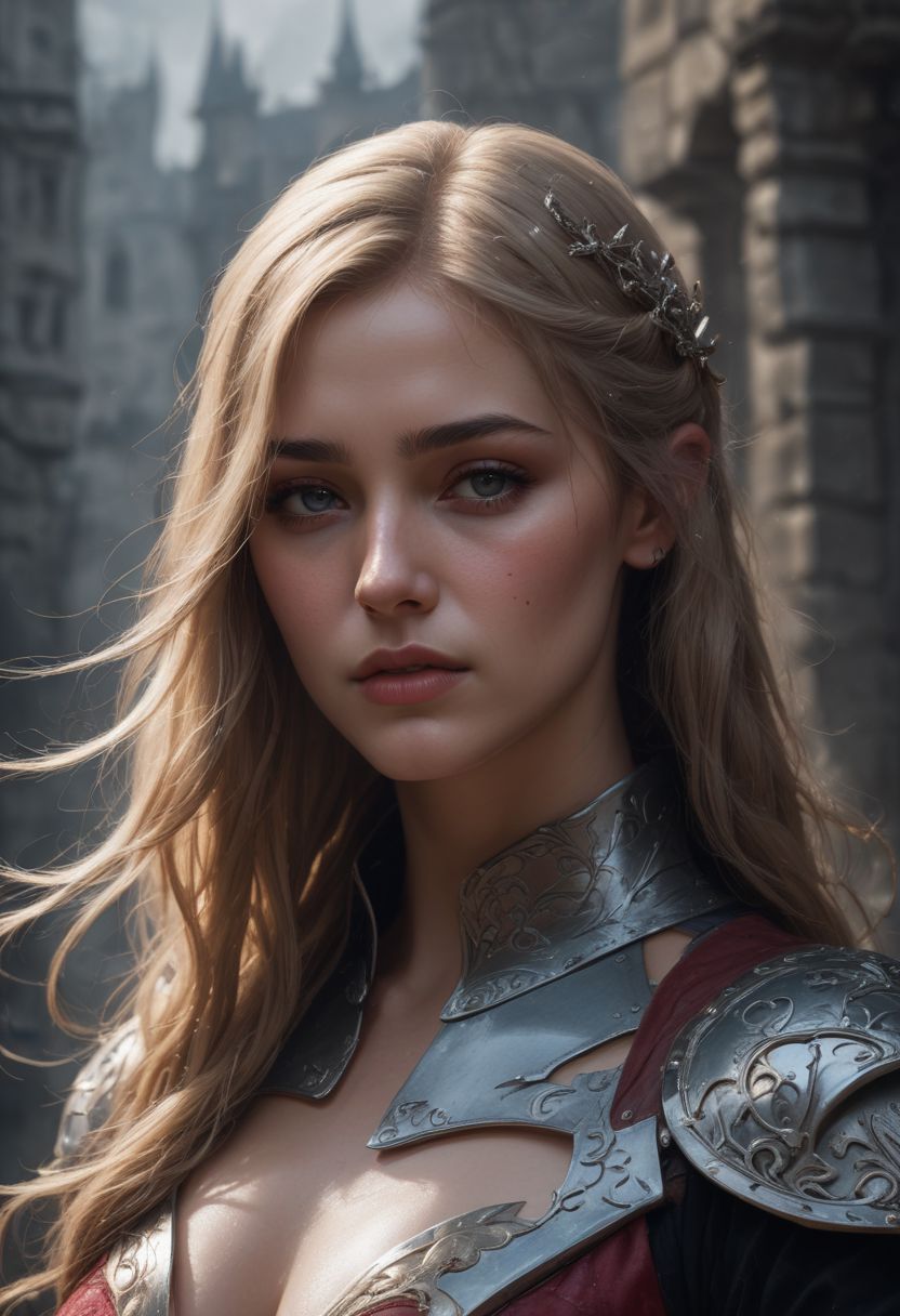 High resolution ultra-realistic of beautiful Warrior Princess, A Warrior Princess clad in a iron armor, red mini skirt, standing among the soldiers in the courtyard of a gloomy castle, head and shoulders portrait, wavy blonde hair, realistic blue eyes, perfect athletic figure, handsome vampire pale bloody face, beautiful perfect detailed pupils, wet oily shiny skin, beautiful firm Breasts, defiant and seductive, 8k resolution concept art portrait by Greg Rutkowski, Dark Ages, Artgerm, WLOP, Alphonse Mucha dynamic lighting hyperdetailed intricately detailed Splash art trending on Artstation triadic colors Unreal Engine, 5 volumetric lighting, Cinematic Lighting, intricate, smooth, sharp focus digital painting, Asymmetrical Balance, hyperdetailed painting, dynamic lighting, Image to video.