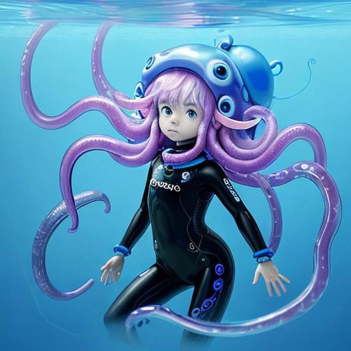 a small, child-like humanoid with a clear and gelatinous looking body made entirely of blue slime, pink alien-like eyes, a giant jellyfish on her head with tentacles that reach down to her back, making it resemble a hat with dreadlock-like hair and she is wearing a black wetsuit with yellow lines.