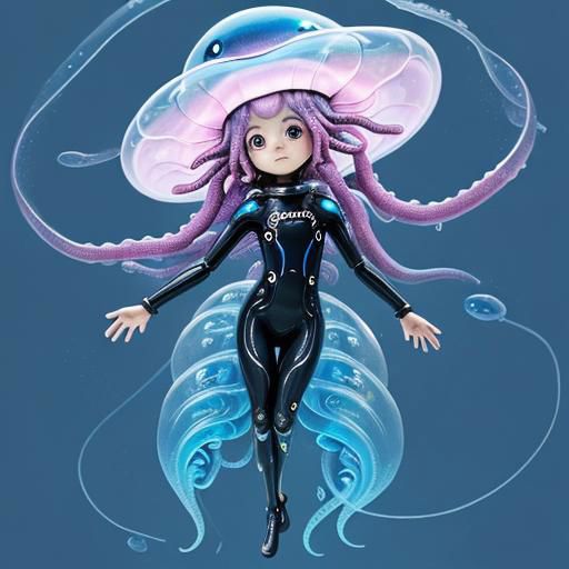 a small, child-like humanoid with a clear and gelatinous looking body made entirely of blue slime, pink alien-like eyes, a giant jellyfish on her head with tentacles that reach down to her back, making it resemble a hat with dreadlock-like hair and she is wearing a black wetsuit with yellow lines.