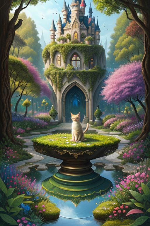Cat, Within a castle, a garden of jewels blooms, its iridescent blossoms sparkling with ethereal beauty, Being focused by lenses or mirrors, intricate details, ultra sharp, fantasy art concept, fantastical fairy tale, whimsical surroundings <lora:free-hand:0.8> free-hand, cartoon illustration