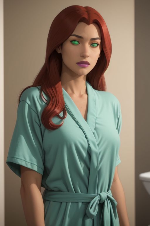 masterpiece, best quality, high quality, highres, upper body, looking at viewer, twilight, sunset, TN_StarfireAdult_bathrobe, 1girl, no pupils, orange skin, toned, long hair, ginger hair, green eyes, exposed breasts, lipstick, makeup, green sclera, lips, armlet, colored sclera, large breasts, glowing eyes, colored skin, eyeshadow, muscular, purple lips, athletic female, very long hair, collarbone, casually showing her body after a shower <lora:CARTOON_DC_TN_StarfireAdult_ownwaifu-15:0.7>