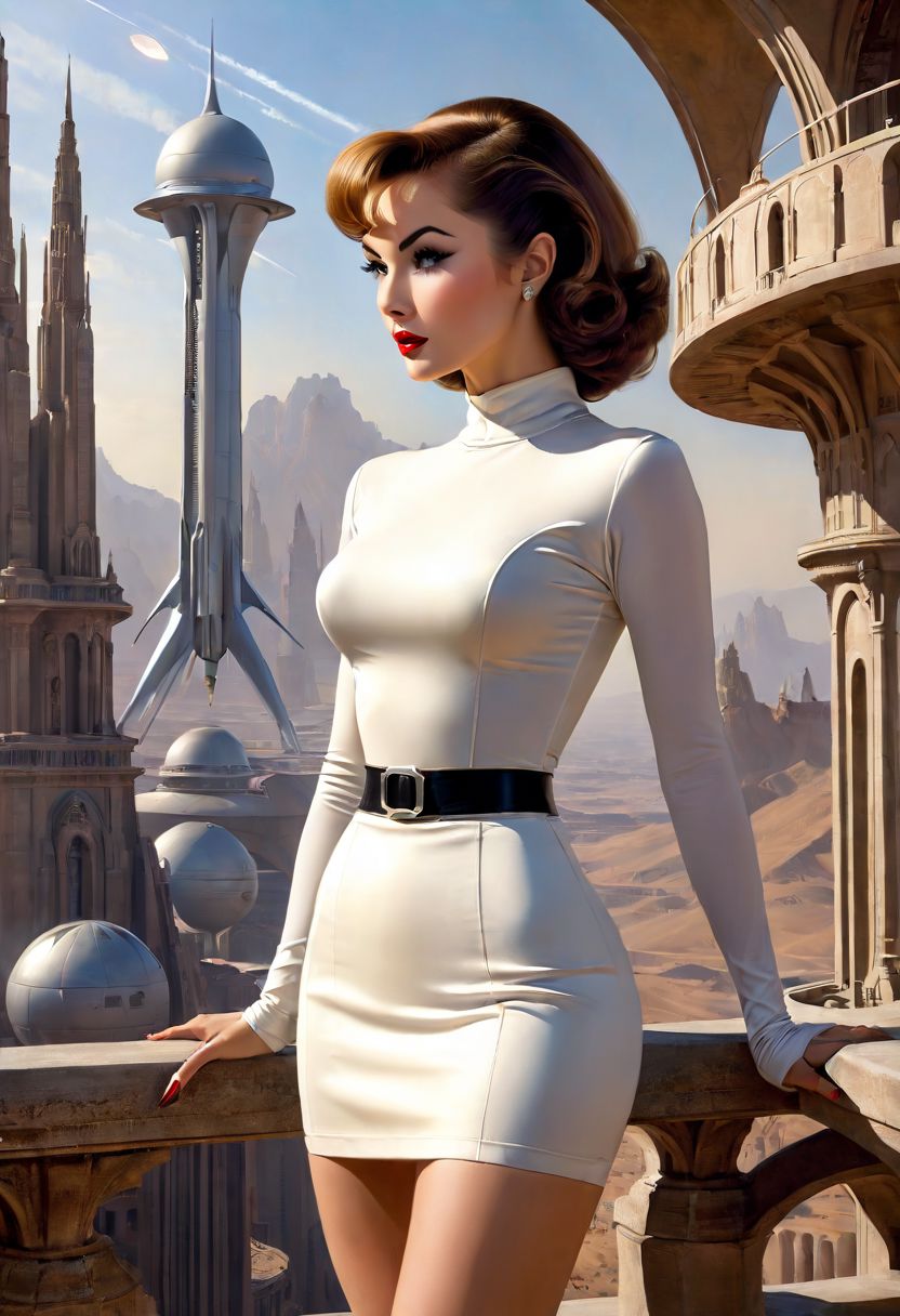 Julie Newmar retro science fiction pinup girl, wearing a low cut skin tight bodice, short short mini skirt, short 60's hair, long legged, narrow waist, narrow hips, surreal perspective, unusual architecture, scifi background, retouched, Professional photography, bokeh, natural lighting, canon lens, shot on dslr 64 megapixels sharp focus, fabulous, stunning, astonishing, glamorous standing pose, Serge Marshennikov, Luis Royo, 16k resolution concept art : fantasy magazine cover art", detailed,