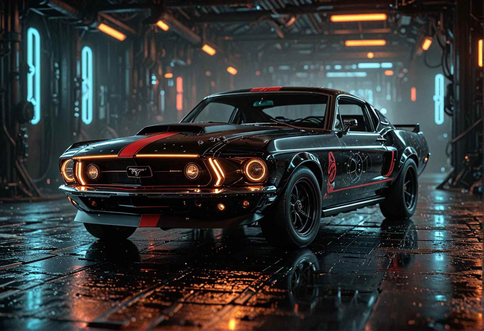 RAW professional photograph taken from the front corner angle of a black and red futuristic 1968 Ford Mustang, featuring advanced aerodynamic modifications and glowing neon accents, set in an intricate steampunk environment adorned with ancient runes and glowing crystals, a skull with glowing eyes for an emblem. The scene is filled with vibrant colors and unusual shapes, with steam-powered machinery and elaborate gears creating a dynamic and surreal atmosphere. The shot is captured on a RED Digital Cinema camera, with dramatic lighting and ethereal highlights enhancing the mystical elements, rendered in 8K resolution. <lora:WildcardX-XL-Detail-Enhancer:1> <lora:Dark_Futuristic_Circuit_Boards:1> circuitboard, dark futuristic