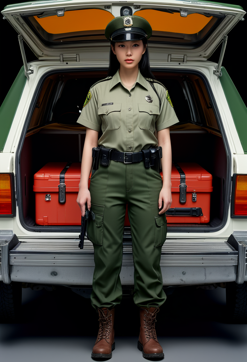 score_9, score_8_up, score_7_up, 1girl (medium full shot) of (supermodel young woman:1.1) police officer, japanese with black hair styled in twin-tails, dark brown eyes, pale skin, petite, wearing Border patrol uniform in olive green, utility shirt, cargo pants, wide-brimmed hat, hiking boots, equipped with a flashlight, scared, vulcan salute, .set in police car Trunk, Spacious compartment containing emergency equipment such as cones, flares, fire extinguisher, portable toolbox, rifle rack with a shotgun secured in place, spare tire tucked away in the corner . Masterpiece,best quality, photorealistic, amazing quality, very aesthetic, extremely detailed face