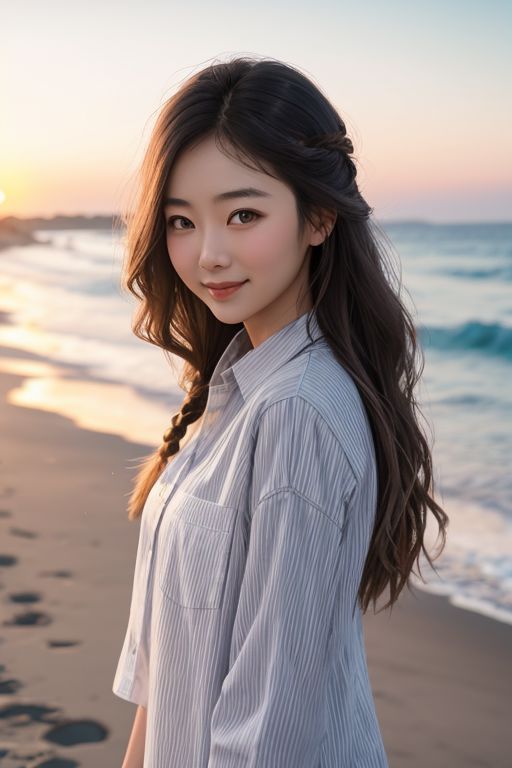 Coastal beauty, Korean woman in a charming summer outfit, ( long braided white hair), striped shirt, (bright eyes, sun-kissed skin, happy expression), sandy beach background, lighthouse, gentle sea breeze, playful pose, dynamic composition, golden hour lighting, blurred background, rich colors, fine details, hyperrealistic, 50mm lens, relaxed atmosphere. portrait photography, 35mm film, natural blurry