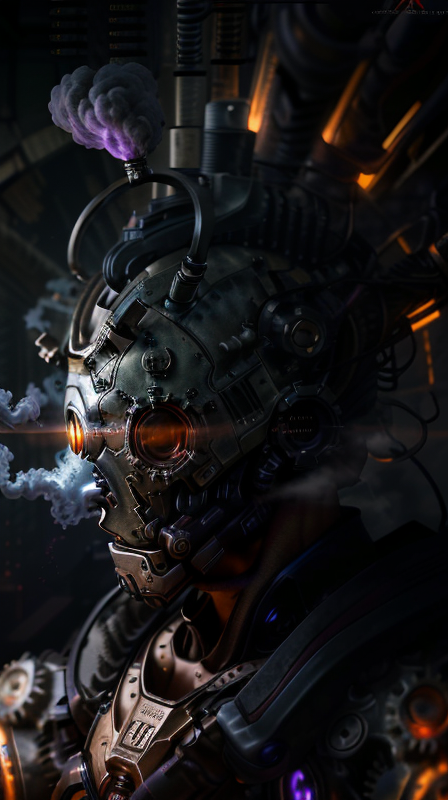 (three quarter side shot), 8k, blurred background, biomechanics, complex a mshn photo robot, ((smoke coming out of head)), (old gears in back of head), mechanical, steampunk, scifi aesthetic, intricate details, foggy ambient, purple and orange lighting, <lora:insanobot:0.6> <lora:mshn:1>