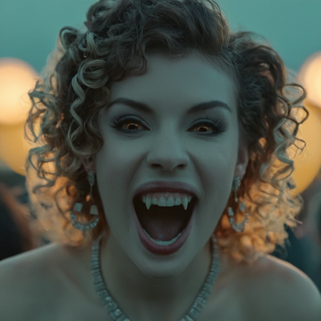 cinematic film still of <lora:vampire style v2:0.9> <lora:celluloid film skintone color style:0.3> Vampire pale skin undead creatures of the night a woman with a big smile on her face,1girl,solo,looking at viewer,smile,short hair,open mouth,jewelry,upper body,earrings,sky,teeth,night,moon,full moon,curly hair,cinematic,filmic,realistic,movie still,horror themed,vampire style , detailed, detailed background, detailed scene, detailed teeth, detailed fangs, shallow depth of field, vignette, highly detailed, high budget, bokeh, cinemascope, moody, epic, gorgeous, film grain, grainy