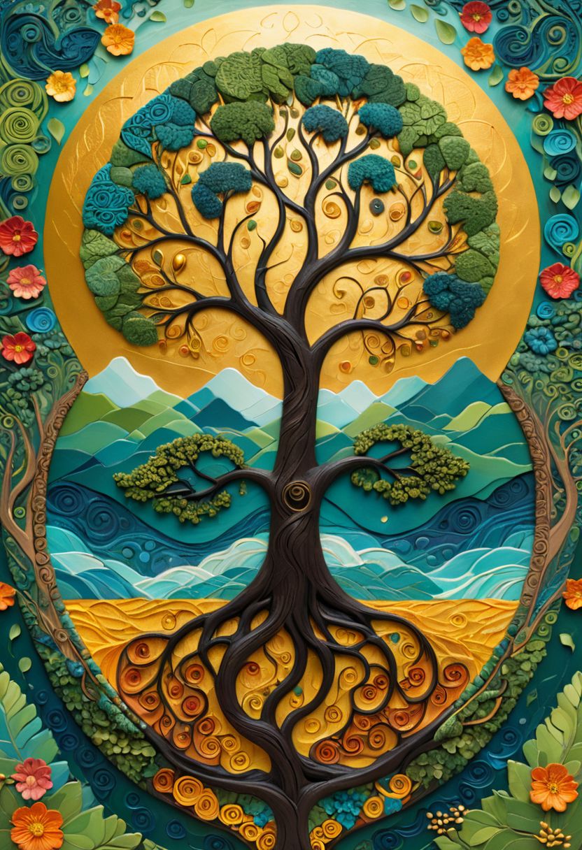 carving style artwork, Impasto style painting of (Earth depicted as a delicate balance of ecosystems, intricate details, realistic style, environmental theme, On the top is 1(Tree of life) symbolizing ecological balance and harmony, detailed intricate roots and branches, vibrant colors, high resolution, inspirational, ecosystem), with a Zentangle-style background, high detail, fine brush strokes, traditional art, golden palette, dynamic composition, artstation, 4k resolution, masterpiece