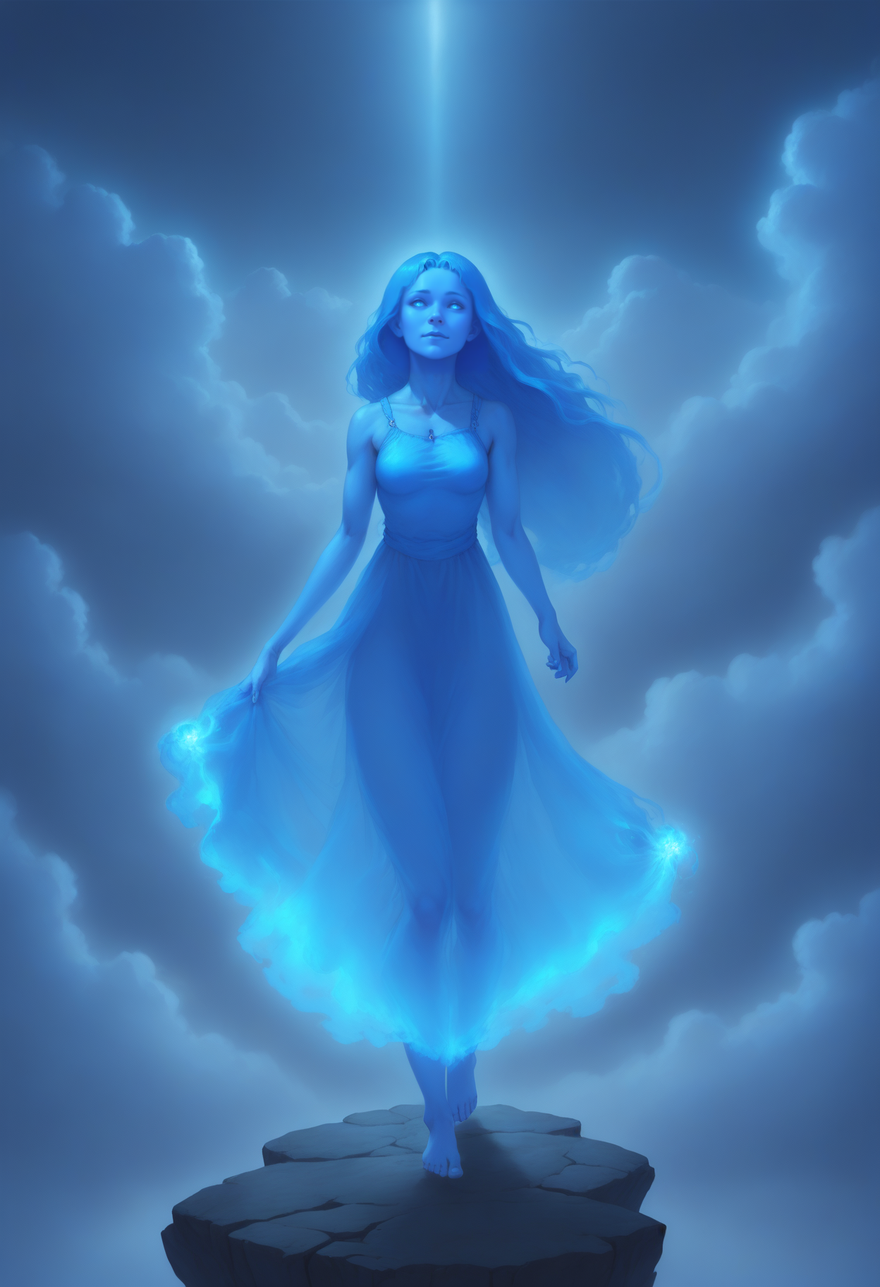 Sylphrena, spren, 1girl, long blue hair, blue skin, blue dress, barefoot, glowing blue light, clouds, mist, <lora:sylphrenahonorspren_sdxl:0.5>
