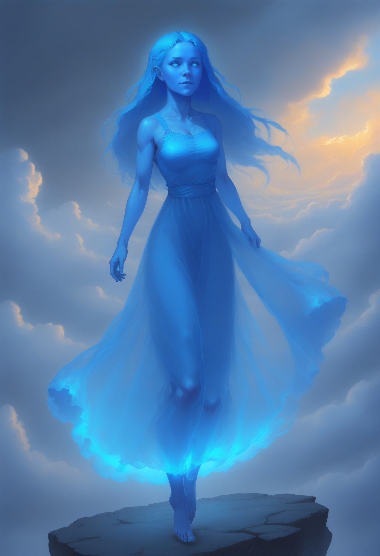 Sylphrena, spren, 1girl, long blue hair, blue skin, blue dress, barefoot, glowing blue light, clouds, mist, <lora:sylphrenahonorspren_sdxl:0.5>