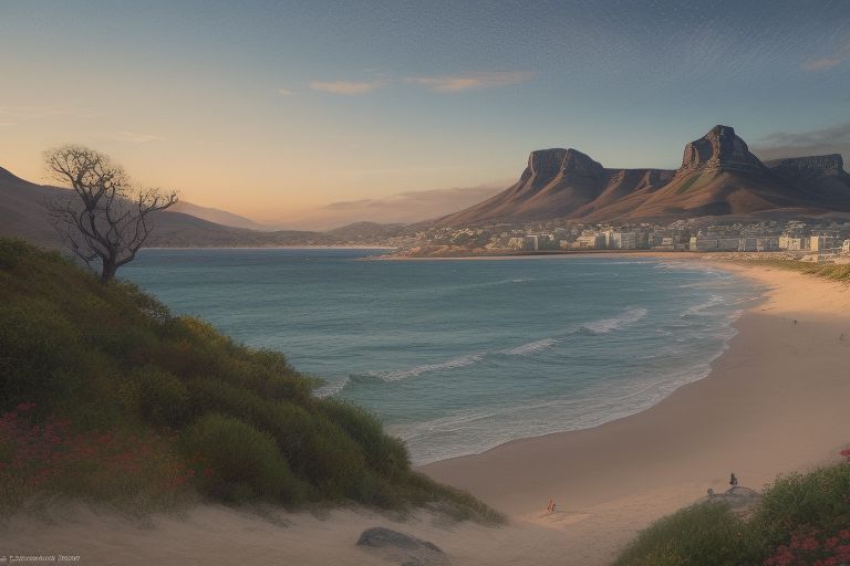 Vincent van Gogh, impressionist style of at sunset in cape town , Landscapes of, the beach, should be the primary focus of each submission, with characters or creatures serving only to enhance the scenery. Submissions that prominently feature individuals, particularly women, as the main subject will be automatically rejected. Please ensure your entries stay true to the theme and integrate any figures seamlessly into the overall landscape.