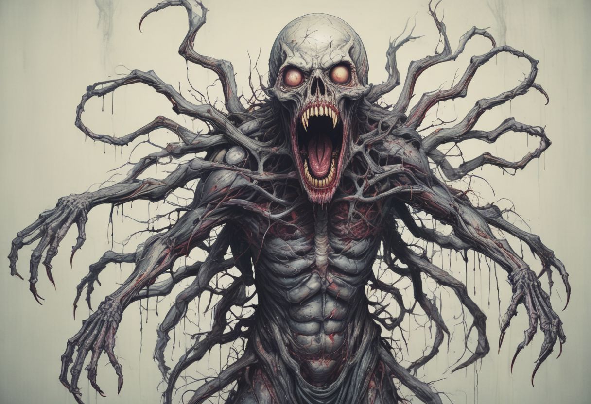horror beast, many arms, many eyes, ruined, 35mm, corpses, blood everywhere, blood, horror, creepy, in the style of junji ito