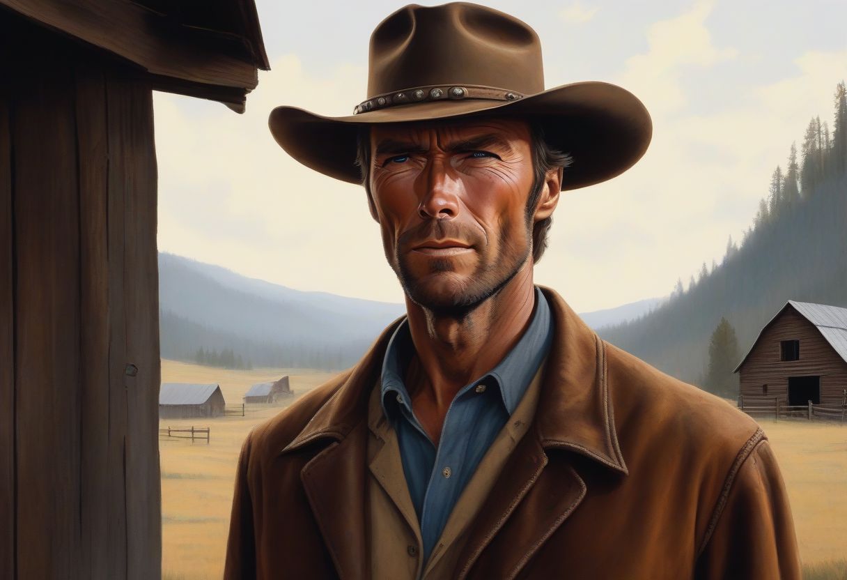 draw a brutal cowboy, looking alike as young Clint Eastwood in a leather brown hat , staying at a barn looking far forward, semi-realism