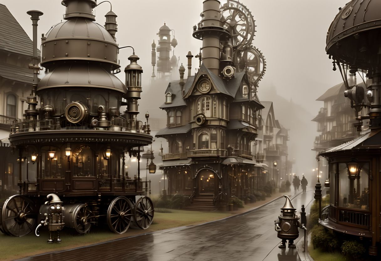 gnome steampunk village with exposed gear-works on rolling hills. buildings made from large riveted bronze plates, shaped wood and mechanical parts and meshed gears. Victorian styled robots wander the streets. one twelve foot tall victorian steampunk robot in the center of town. foggy background. sepia image only. photo realistic image.