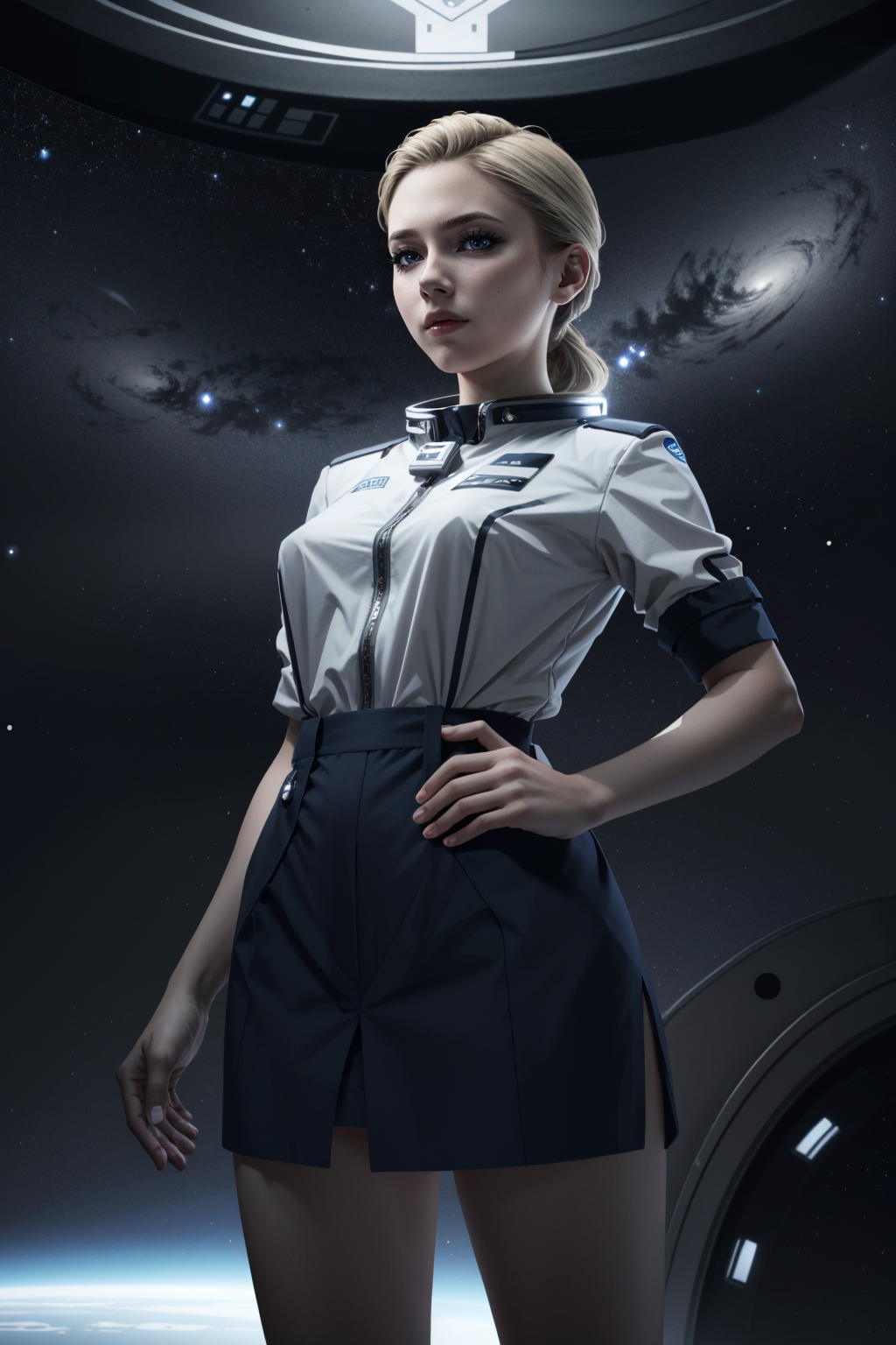 ((masterpiece, best quality)) <lora:DChloe:0.8> DChloe, 1girl, solo, inside a futuristic space station, stars and space background, standing straight with hands clasped behind