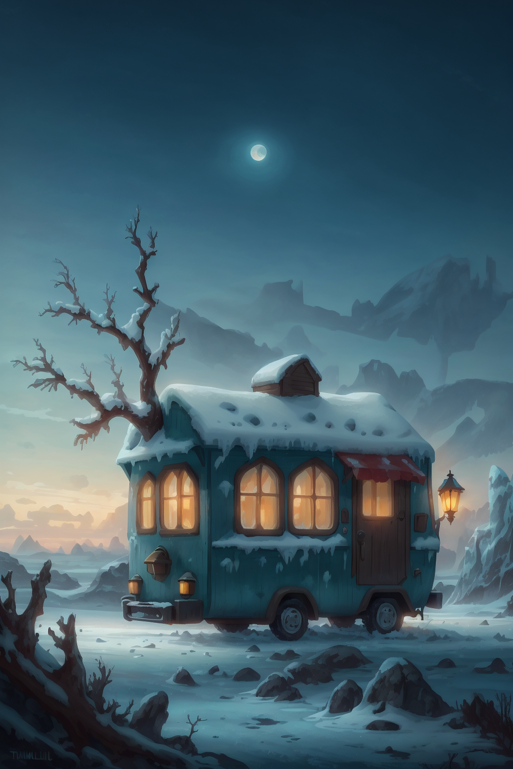 a Trailer in The Frozen Wasteland landscape at Twilight, whimsical