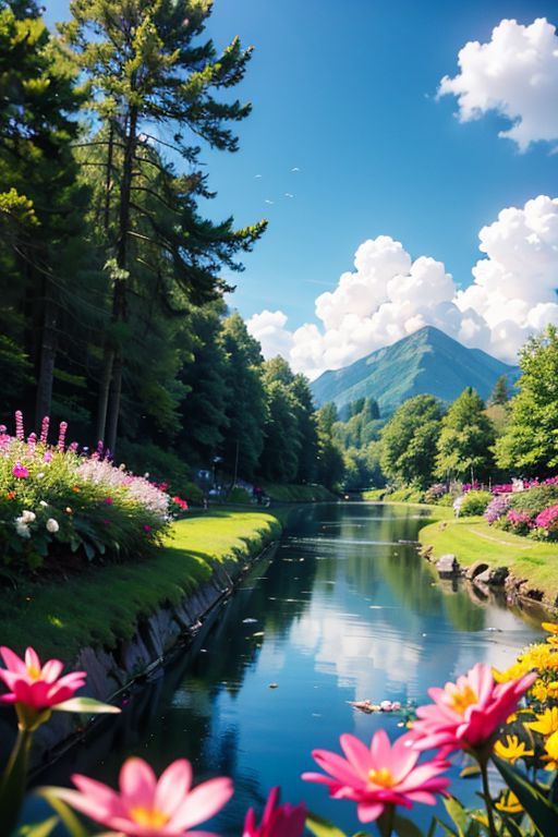 hyper-realistic, real life, analogue style, raw, photo, In a garden full of flowers of all colors, there lived a butterfly. It was not just any butterfly, it was unique, with bright blue wings that reflected the sunlight as if they were mirrors. While flying near a pond, he saw his reflection in the water. She was amazed to see how beautiful she was. At that moment, she realized that she didn't need anyone else to be happy, mountain, waterfall, sun sunrise, clouds, bright, landscape, real world location,